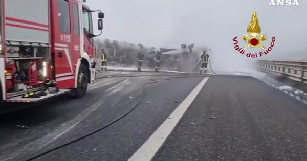 Cisterna in fiamme in A1: il video dei vigili del fuoco.