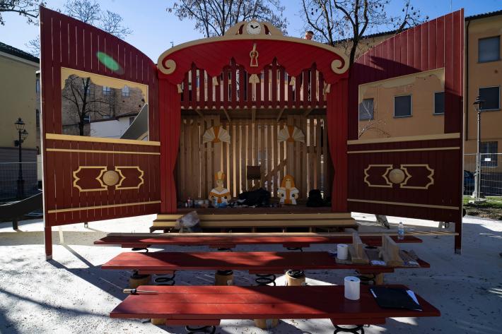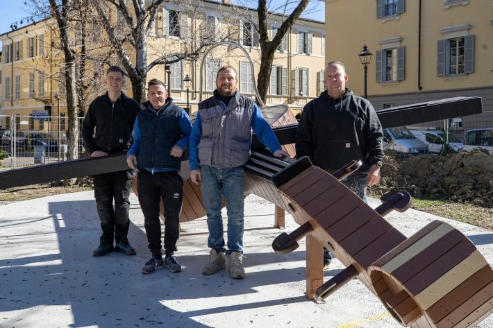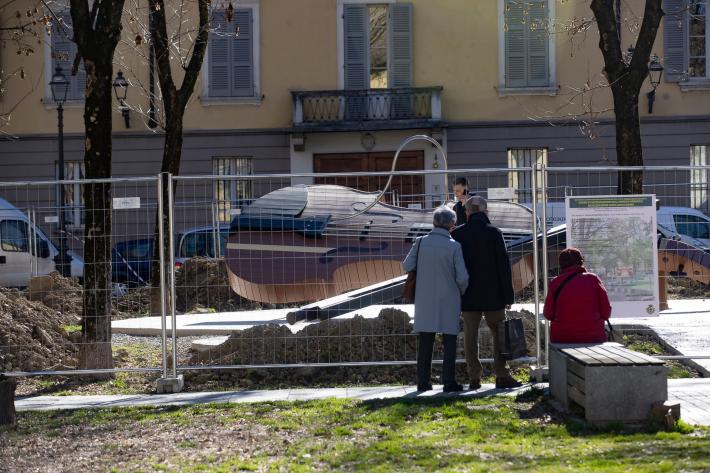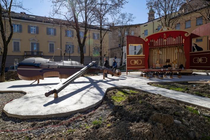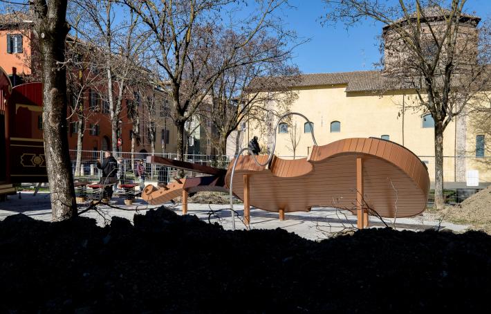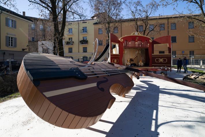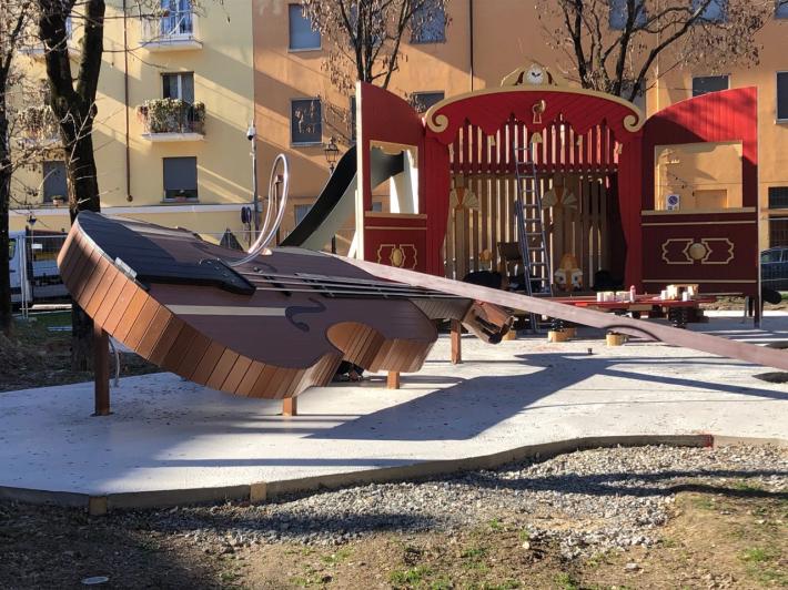 Ecco come sta rinascendo Piazzale Salvo D'Acquisto: grazie alla donazione di una privata cittadina il parco giochi cambia veste e diventa "verdiano" (e bellissimo), facendo già sgranare gli occhi a bambini e passanti grazie a uno dei primi allestimenti: quello di un maxi-violino. Tutto da giocare, ovviamente.