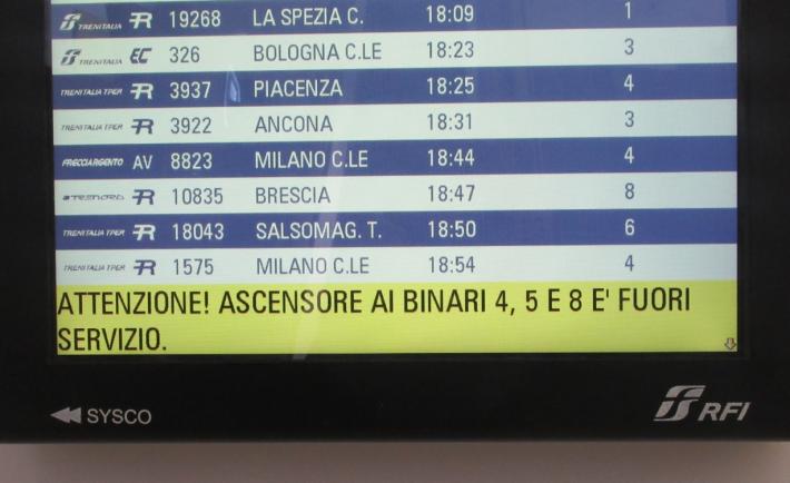 Nei tabelloni elettronici è riportata l’indicazione che alcuni ascensori non funzionano. Speriamo che l’indicazione sparisca al più presto, assieme al triste «spettacolo» degli ascensori bloccati tra un piano e l’altro. Martedì 3 inizia Cibus e sarebbe bene che la stazione non presenti disagi per i visitatori della fiera che avranno scelto di arrivare a Parma in treno.