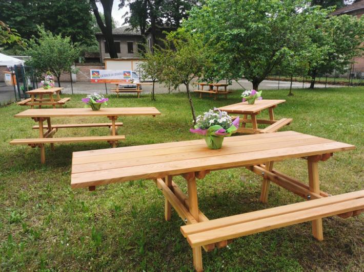 L’area verde è già attrezzata con sei grandi tavoli di legno, e relative panche, speciali: sono infatti realizzati in modo da poter ospitare comodamente persone con disabilità in carrozzina. Tali arredi, che arricchiscono la bellezza e l’accessibilità del giardino, sono stati donati dal Motoclub Dukes Parma.