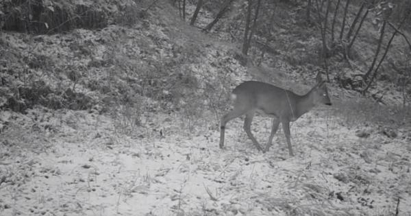 Sotto una leggera nevicata un capriolo giovane, ben visibili i piccoli abbozzi del nuovo palco in formazione (nelle immagini visibili come due piccoli bernoccoli di velluto sulla fronte), si muove in una piccola radura nel bosco in cerca di qualche filo d'erba o germoglio più gustoso.