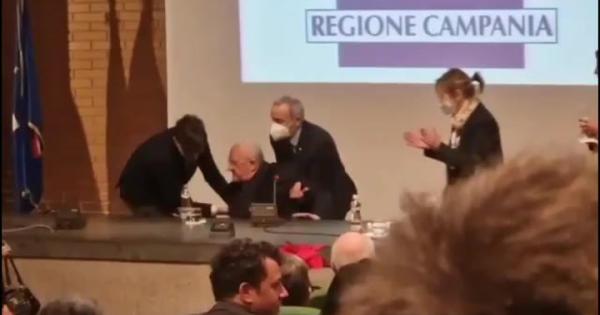 Caduta clamorosa durante il brindisi di fine anno a Palazzo Santa Lucia, a Napoli per il presidente della Regione, Vincenzo De Luca. Il governatore della Campania si alza per alzare i calici, mentre uno degli addetti ai servizi gli sposta la sedia. De Luca, senza rendersi conto, fa per sedersi e cade a terra, per fortuna senza riportare nessuna conseguenza. Il governatore, come si vede nelle immagini, si rialza subito e, con la sua solita ironia, riesce anche a scherzarci su. “I portaseccia”, dice scherzando e sorridendo.
