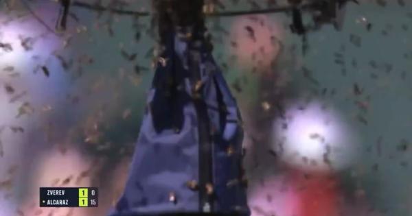 Nel terzo game del primo set, Alcaraz mentre batte, viene letteralmente attaccato da uno sciame di api. Guarda il video