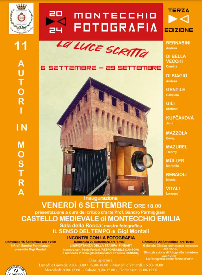 Il fiume Mekong e gli angoli più "nascosti" delle città europee, gli autoritratti "a tema" e le foto "di famiglia", il corpo femminile immortalato da diversi punti di vista. E tanto altro. La rassegna Montecchio fotografia - La luce scritta propone gli scatti di otto autori italiani - scelti da Parma a Bologna, dalla Lombardia al Lazio - e tre europei (Francia, Germania, Repubblica Ceca). La mostra è allestita al piano terra del castello di Montecchio, mentre al primo piano - nella Sala della Rocca - è allestita la personale del colornese Gigi Montali "Il senso del tempo".