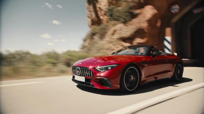 Come prima, più di prima: la configurazione 2+2 non è mai stata sua abitudine. Idem la trazione integrale. E sotto il cofano? Che domande, c’è il V8 AMG da 4,0 litri. E niente elettrificazione. Non per ora...Il design rispecchia le tipiche proporzioni SL: passo generoso, sbalzi corti, cofano motore lungo, abitacolo arretrato con parabrezza molto inclinato, coda poderosa. Il posizionamento «racing» ha dunque influenzato anche la scelta di un tettuccio in tela tristrato a comando elettrico, piuttosto che il solito tetto rigido ripiegabile in metallo: 21 kg di peso in meno, uguale abbassamento del baricentro, uguale miglior dinamica di marcia e maneggevolezza. Le manovre di apertura e chiusura durano appena 15”, fino a una velocità di 60 km/h.