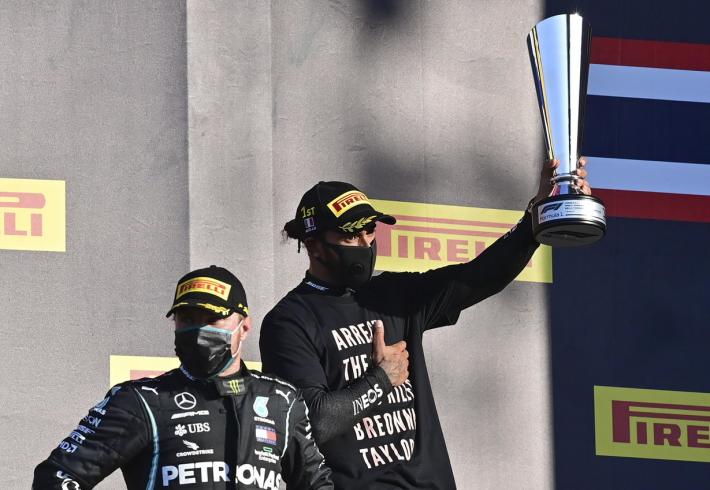 Bandiera rossa, piloti in pit-lane e ritiro anche per la Renault di Ocon per problemi tecnici. Passano i minuti, cresce la tensione e la gara riparte dalla griglia dove Hamilton scavalca agevolmente Bottas mentre Leclerc, terzo, soffre il ritmo di una Ferrari poco competitiva subendo i sorpassi in fila di Stroll, Ricciardo, Albon e Perez prima di tornare ai box per l’inevitabile cambio gomma. E quando tutto sembrava finito, con Hamilton davanti a Bottas con 6 secondi di vantaggio, arriva la seconda bandiera rossa per un incidente contro le barriere da parte di Stroll. Nuova procedura e nuova ripartenza a soli 14 giri dalla fine con il britannico che batte nuovamente il compagno di squadra, lasciato in balia degli attacchi di Ricciardo e Albon. Ritmo impressionante con cui nella fase finale centra il giro più veloce e si assicura la novantesima vittoria in carriera andando a -1 dal record di Schumacher. "E' pazzesco ottenere la novantesima vittoria, è tutto annebbiato nella mia testa - ha dichiarato Hamilton -. Oggi abbiamo vissuto tre gare diverse nello stesso giorno e le ripartenze sono state tanto incredibili quanto difficili".
