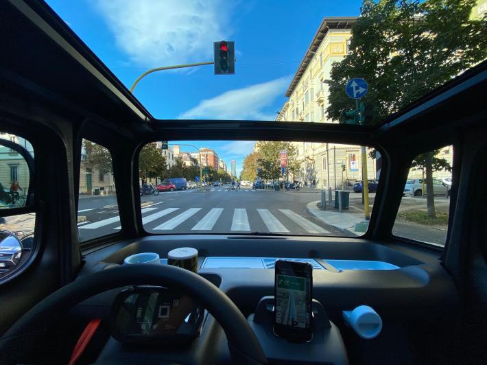 Dentro c'è spazio per due, sfalsati di qualche centimetro per migliorare il comfort. L'interno plasticoso e spartano sembra uscito dal cartoon di Cars, la seduta non è il massimo della comodità ma per un percorso urbano va bene, quello che invece sbalordisce è la visibilità in ogni direzione, sembra quasi di viaggiare open air. Strumentazione all'osso ma spazio per l'accessorio fondamentale: lo smartphone da piazzare e utilizzare facilmente come navigatore e/o sorgente musicale.