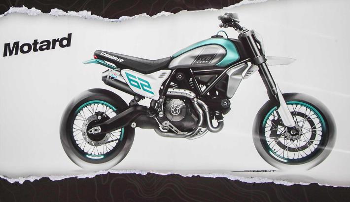 Ma le vere novità di casa Scrambler devono ancora arrivare, a EICMA dove potremo vedere in carne e ossa quello che oggi abbiamo visto solo disegnato, ovvero due concept bike che sposano il mondo motard e quello delle moto da rally con tanto di ruota da ventuno e carenatura dakariana. Una moto che riporta la memoria ai tempi in cui Edi Orioli correva la Dakar con la Cagiva Elefant motorizzata Ducati e che apre a scenari interessanti. Una moto più Ducati che Scrambler, in verità, ma che se arrivasse sul mercato (con motore 1100 ad aria) potrebbe dire veramente la sua. Staremo a vedere.