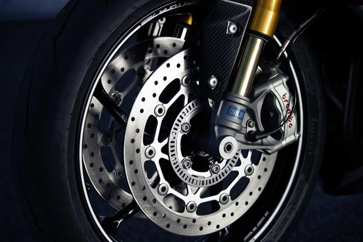 Anche a livello di ciclistica la Daytona non scherza, partendo come detto dall’apprezzatissimo telaio della supersport, la 765 monta sospensioni Öhlins (forcella NIX30 con steli da 43 mm e monoammortizzatore TTX36) e pinze Brembo Stylema (una primizia nel segmento, a oggi le montano solo Aprilia RSV4 1100 Factory e Ducati Panigale V4S) azionate da una pompa radiale MCS. Triumph annuncia la moto come più leggera della precedente Daytona 675 (che ricordiamolo, pesa nella versione R 167 kg a secco) grazie anche all’utilizzo di nuove ruote leggere, alla carenatura in carbonio e alla lucidatura di telaio e forcellone che non essendo più verniciati sono ora più leggeri. Quando prende la grammomania… Una moto da godersi rigorosamente da soli, perché la configurazione è monoposto. Attenzione, in questa cilindrata la Daytona non potrebbe correre in nessun campionato. Ma i regolamenti si possono sempre cambiare. O no?