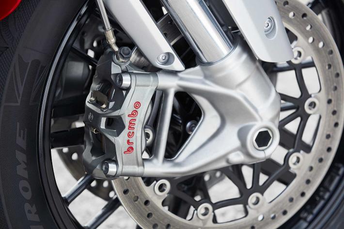 Se il reparto sospensioni è di una eccellenza scontata, con Showa che fornisce sia la forcella (USD a cartuccia, con steli da 47, completamente regolabile) così come il mono piggyback (anch’esso regolabile nel precarico e nell’idraulica, da remoto) montato in posizione laterale. I freni fanno scintillare gli occhi, in particolare il doppio disco anteriore con pinze Brembo M4.30 Stylema, monoblocco ad attacco radiale.