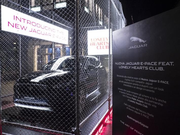 Jaguar e Palm Angels insieme per una inattesa collaborazione. Per l’anteprima italiana di E-Pace, il nuovo Suv compatto di Jaguar, i due brand hanno realizzato "Lonely Hearts Club Palm Angels for Jaguar", un secret club dal concept innovativo, aperto in questo fine settimana durante la fashion week milanese. La creatività anticonformista di Francesco Ragazzi, direttore creativo di Palm Angels, ha trasformato il club in uno spazio dall’estetica urbana e che si ispira alle luci della nightlife californiana. Neon, reti metalliche, atmosfere dark e una policy “members only”, per offrire una nuova energia creativa tra hip hop, R’n’B e musica elettronica. All’esterno del club è stata esposta per la serata la nuova Jaguar E-Pace con un’installazione ispirata agli interni del Lonely Hearts Club Palm Angels for Jaguar. L’auto sarà in esposizione fino al 24 settembre in Largo La Foppa con un insolito allestimento metropolitano.