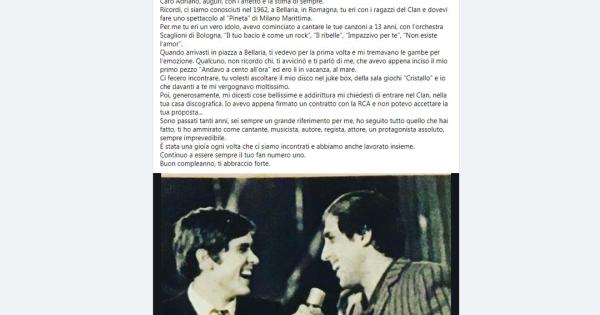 «Caro Adriano, auguri, con l’affetto e la stima di sempre. Ricordi - scrive Morandi - ci siamo conosciuti nel 1962, a Bellaria, in Romagna, tu eri con i ragazzi del Clan e dovevi fare uno spettacolo al 'Pinetà di Milano Marittima. Per me tu eri un vero idolo, avevo cominciato a cantare le tue canzoni a 13 anni, con l’orchestra Scaglioni di Bologna, 'Il tuo bacio è come un rock', 'Il ribellè, 'Impazzivo per tè, 'Non esiste l'amor'». «Quando arrivasti in piazza a Bellaria, ti vedevo per la prima volta e mi tremavano le gambe per l’emozione. Qualcuno, non ricordo chi, ti avvicinò e ti parlò di me, che avevo appena inciso il mio primo pezzo 'Andavo a cento all’orà ed ero lì in vacanza, al mare. Ci fecero incontrare, tu volesti ascoltare il mio disco nel juke box, della sala giochi 'Cristallò e io che davanti a te mi vergognavo moltissimo. Poi, generosamente, mi dicesti cose bellissime e addirittura mi chiedesti di entrare nel Clan, nella tua casa discografica. Io avevo appena firmato un contratto con la RcA e non potevo accettare la tua proposta...». E dopo tanti anni «sei sempre un grande riferimento per me, ho seguito tutto quello che hai fatto, ti ho ammirato come cantante, musicista, autore, regista, attore, un protagonista assoluto, sempre imprevedibile. E’ stata una gioia ogni volta che ci siamo incontrati e abbiamo anche lavorato insieme».