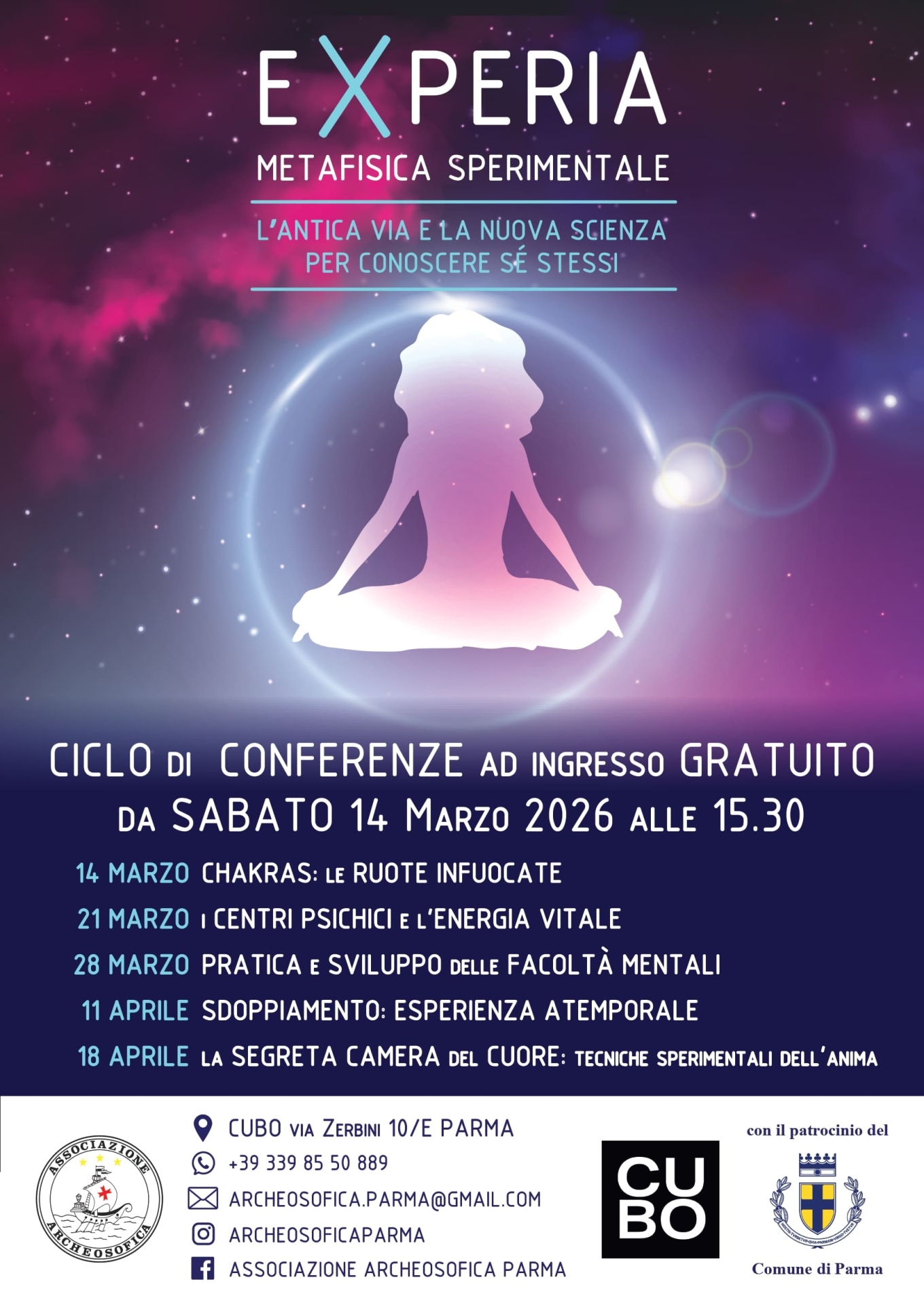 Per esplorare questo legame, l’Associazione Archeosofica, con il patrocinio del Comune di Parma, presenta "Experia", una rassegna dedicata ai Chakra – i cosiddetti "centri di forza" che fungono da ponti tra il visibile e l’invisibile. Non si tratterà solo di teoria, ma di un'indagine che include studi sulle facoltà mentali e sperimentazioni interiori, cercando di unire la saggezza antica con le moderne riflessioni sulla coscienza.
