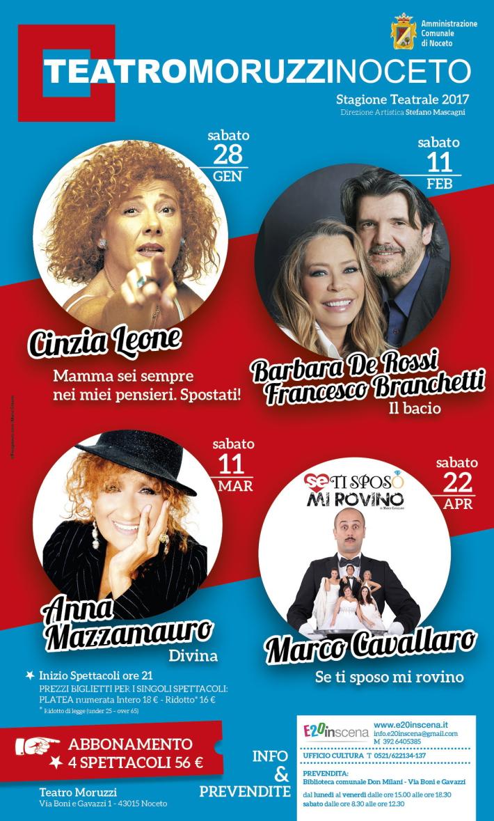 Grandi nomi nella nuova stagione teatrale firmata dall’Amministrazione comunale di Noceto e dall’associazione E20in scena con il suo direttore artistico Stefano Mascagni. 4 gli spettacoli, che spaziano dal teatro comico alla commedia romantica, dal monologo alle produzioni corali. Il debutto al Teatro Moruzzi sabato 28 gennaio alle ore 21 con Cinzia Leone e il suo divertente lavoro in tournèe da alcuni anni “Mamma sei sempre nei miei pensieri. Spostati!”. Sabato 11 febbraio è la volta dello spettacolo “Il bacio” un testo intimo di Ger Thijs intepretato da Barbara De Rossi e Francesco Branchetti. Sabato 11 marzo Anna Mazzamauro sarà la protagonista della commedia francese “Divina”. La stagione si chiude sabato 22 aprile con la commedia record di incassi a Roma e Milano, scritta, diretta e interpretata da Marco Cavallaro, “Se ti sposo mi rovino”. I biglietti, intero Euro 18; ridotto Euro 16, abbonamento a 4 spettacoli, Euro 56, sono in vendita alla Biblioteca comunale Don Milani di Noceto dal lunedì al venerdì dalle 15 alle 18.30; il sabato dalle 8.30 alle 12.30. Info, ufficio cultura: tel. 0521 622134.