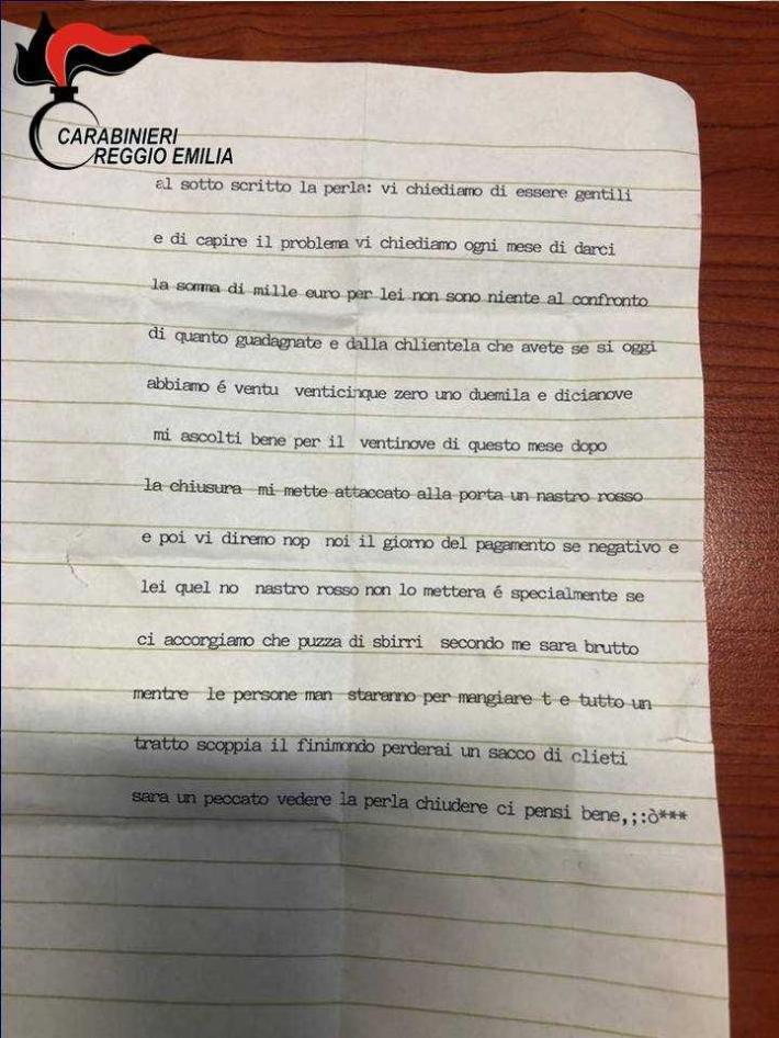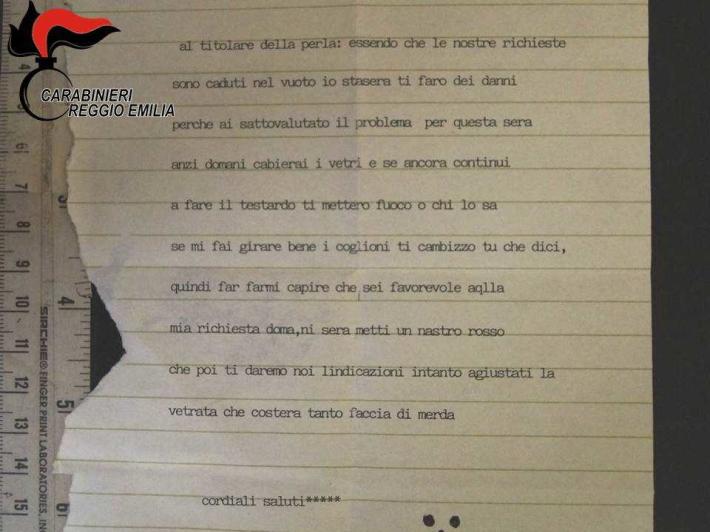 Ecco alcuni dei "pizzini" ritrovati dagli investigatori. «Al sottoscritto La Perla: vi chiediamo di essere gentile e di capire il problema. Vi chiediamo mille euro per lei non sono niente in confronto a quanto guadagnate», si legge in uno dei fogli lasciati nella pizzeria La Perla di Cadelbosco Sopra, contro cui sono stati sparati sei colpi di pistola nella notte tra il 31 gennaio e il 1° febbraio. A scatenare la furia degli indagati sarebbe stato il rifiuto da parte del titolare di assecondare le richieste.
