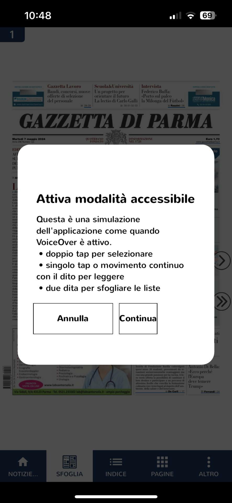 Una volta compiuto questo passaggio, basterà toccare lo schermo per usufruire della voce guida. Il primo tocco permetterà di capire in quale posizione ci si trova: edizione, sezione, titolo o testo. Un doppio tocco avvierà invece la lettura dell'edizione e dell'articolo desiderato. Da computer è inoltre possibile scegliere la tonalità di voce desiderata e la velocità di lettura.