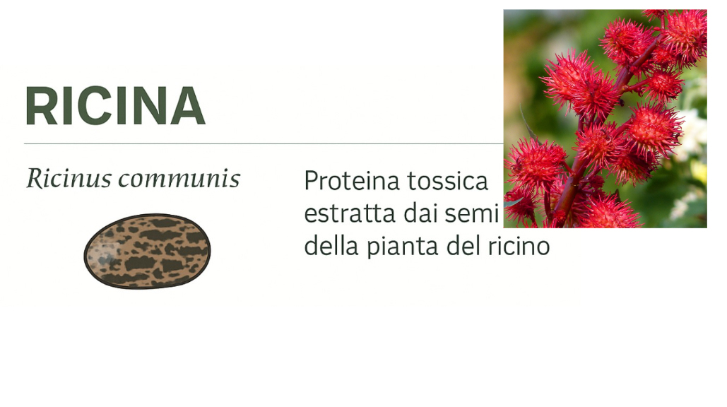 La ricina è una proteina tossica, una cosiddetta toxalbumina, estratta dai semi del ricino (Ricinus communis). È costituita da due catene, A e B, unite da un ponte disolfuro: la catena B si comporta come “gancio” che aderisce ai recettori su molte cellule, mentre la catena A è l’“arma” vera e propria che disattiva la sintesi proteica. La tossina non è presente nell’olio di ricino raffinato per uso farmaceutico, ma si concentra in particolare nel rivestimento dei semi non trattati. Per questo motivo, la manipolazione richiede cautele di biosicurezza; come ogni informazione sensibile, i protocolli operativi non vengono divulgati al pubblico.