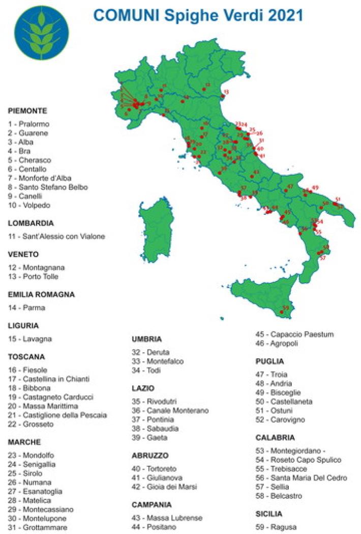 Le Spighe Verdi 2021 sono state assegnate in 14 Regioni. Cresce il Piemonte che arriva a ottenere il maggior numero di riconoscimenti con 10 Spighe Verdi: Alba, Bra, Canelli, Centallo, Cherasco, Guarene, Monforte d’Alba, Pralormo, Santo Stefano Belbo, e Volpedo. Subito dopo le Marche, con 9 località premiate: Esanatoglia, Grottammare, Matelica, Mondolfo, Montecassiano, Montelupone, Numana, Senigallia, Sirolo; segue la Toscana con 7 riconoscimenti: Bibbona, Castellina in Chianti, Castiglione della Pescaia, Castagneto Carducci, Fiesole, Grosseto, Massa Marittima. Con 6 località seguono la Calabria e la Puglia. Per la Calabria: Belcastro, Montegiordano, Roseto Capo Spulico, Santa Maria del Cedro, Sellia, Trebisacce. Per la Puglia: Andria, Bisceglie, Castellaneta, Carovigno, Ostuni, Troia. Con 5 località segue il Lazio: Canale Monterano, Gaeta, Pontinia, Rivodutri, Sabaudia. La Campania riceve 4 riconoscimenti Spighe Verdi: Agropoli, Capaccio Paestum, Massa Lubrense, Positano. Seguono Abruzzo e Umbria con 3 Spighe Verdi. Per l’Abruzzo: Gioia dei Marsi; Giulianova, Tortoreto; per l’Umbria: Deruta, Montefalco, Todi. Il Veneto vanta due località: Montagnana e Porto Tolle. Vi è un Comune rurale Spiga Verde in Emilia-Romagna (Parma), in Liguria (Lavagna), in Lombardia (Sant’Alessio con Vialone) e in Sicilia (Ragusa).