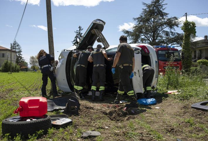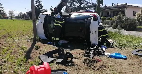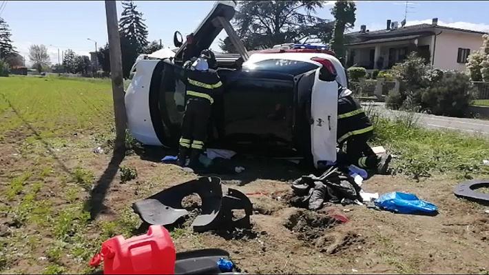 Un'auto è finita fuori strada ed è andata a schiantarsi contro un palo nel campo a lato di strada Argini, ribaltandosi.