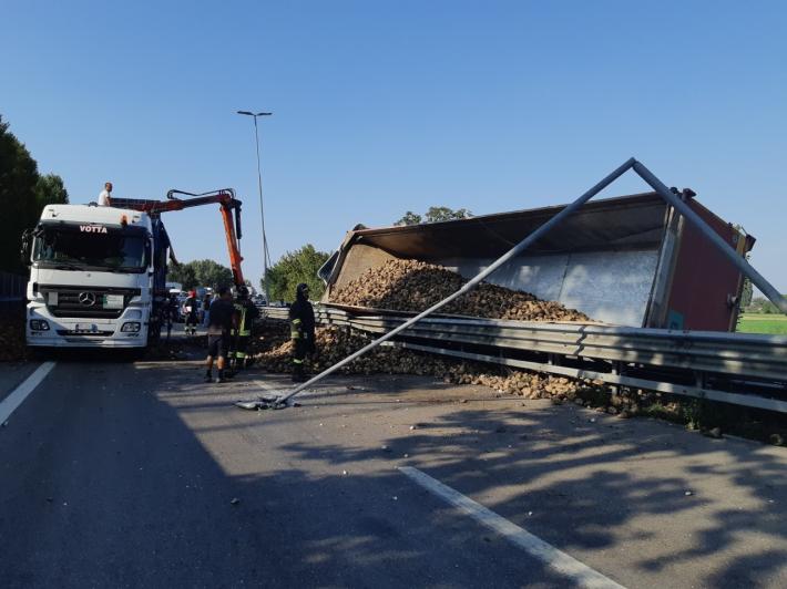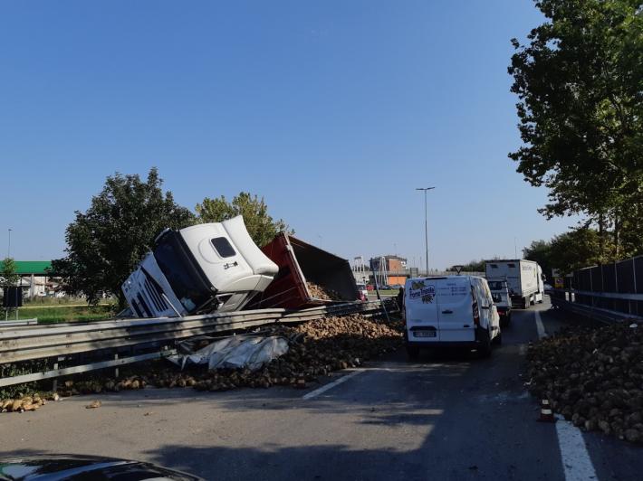 Un camion che trasportava barbabietole si è ribaltato intorno alle 16 sulla tangenziale nord di Parma all'altezza della rotonda di via Emilia Est. Si sta lavorando per sgomberare la sede stradale. Disagi al traffico, tangenziale chiusa in direzione Reggio e  lunghe code per ore in molte arterie della zona. Sul posto sono intervenuti i vigili del fuoco, la polizia municipale e i tecnici dell'Anas per un lungo lavoro di rimozione. Nessuna conseguenza per l'autista del camion, che probabilmente ha effettuato la curva a velocità troppo elevata facendo uscire il carico.