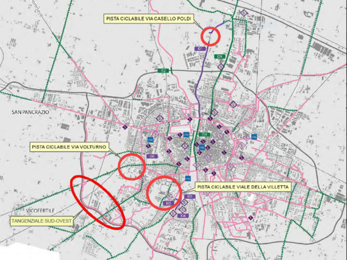 Proseguono gli interventi per ampliare la rete di piste ciclabili cittadine con 4 nuovi itinerari che collegano tratti esistenti, quali il collegamento in Tangenziale Sud fra Parma Mia e strada Martiri della Liberazione a Vicofertile; viale della Villetta, dall'ingresso principale del Cimitero a via Chiavari; via Volturno, da via Fleming a Cà Peschiere e, in fine, l’intervento in via Casello Poldi, come ricucitura conclusiva di via Europa.