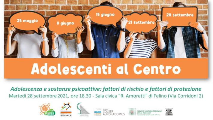 “Adolescenti e sostanze psicoattive: fattori di rischio e fattori di protezione” è il titolo del quinto e ultimo appuntamento di “Adolescenti al Centro”, che si svolgerà nella Sala Civica “Remigio Amoretti” di Felino (Via Corridoni, 2) alle 18.30 di martedì 28 settembre.