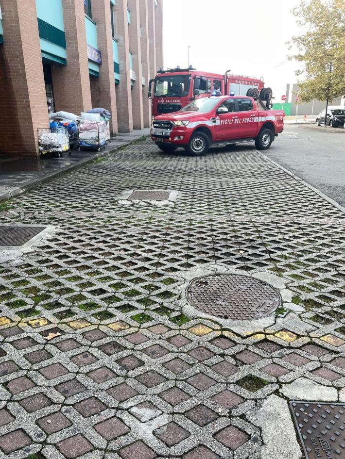 Vigili del fuoco al lavoro all'Eurotorri da questa mattina, quando è stata scoperta una perdita d'acqua, probabilmente proveniente dal piano superiore dell'edificio, che ha semiallagato la lavanderia al pianterreno.