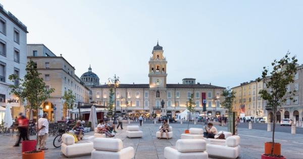 Panchina Post Pandemica è un un monumento temporaneo alla pandemia e al lockdown, un’installazione collocata nella piazza principale di Parma da aprile a ottobre 2021. Ideato da Francesca De Angelis, Francesca Giannini e Alice Giroldini durante l’isolamento forzato da Covid-19 dell’inverno-primavera 2020, porta nella pubblica piazza i simboli della quarantena: il salotto di casa diventa un divano a cielo aperto e incontra la dimensione naturale, rappresentata dagli alberi inseriti nelle sedute per assicurare la distanza di sicurezza. Nel corso dei mesi, i moduli dell’installazione hanno cambiato posizione, ripercorrendo così le varie fasi della pandemia, in una evoluzione continua dalla distanza ad una ritrovata vicinanza arricchita dagli eventi organizzati dalle ideatrici del progetto e dalla contemporeanea ricerca partecipativa i cui esiti sono pubblicati sul sito web panchinapostpandemica.it