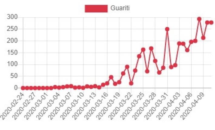 Continuano, nel frattempo, a salire le guarigioni, che raggiungono quota 3.659 (+278), delle quali 1.934 riguardano persone “clinicamente guarite”, divenute cioè asintomatiche dopo aver presentato manifestazioni cliniche associate all’infezione; 1.725 quelle dichiarate guarite a tutti gli effetti perché risultate negative in due test consecutivi.