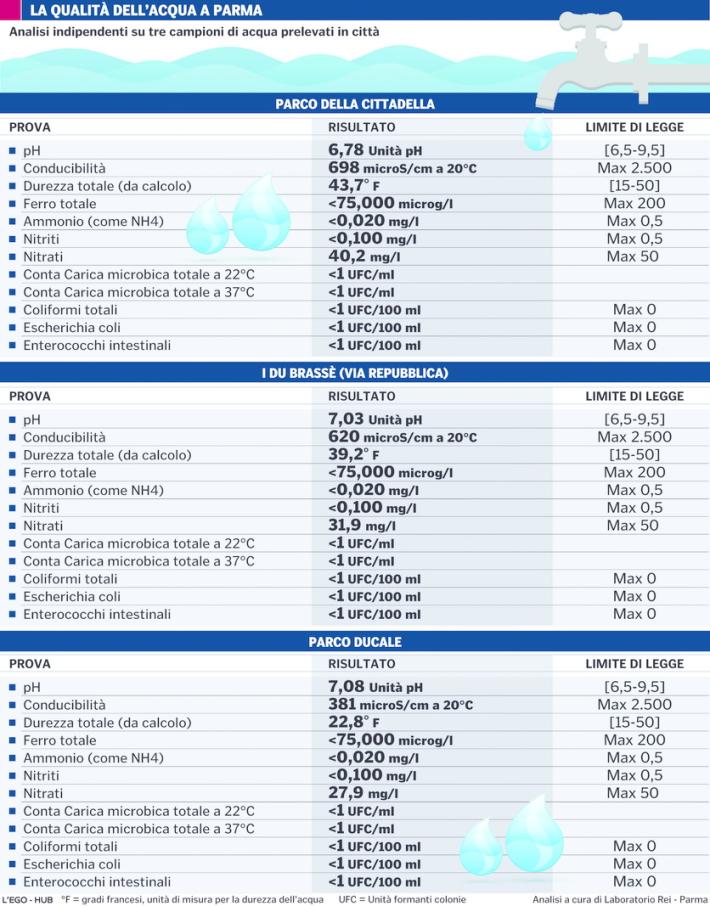 La Gazzetta di Parma ha fatto analizzare da una struttura indipendente - il laboratorio Rei - tre campioni di acqua, prelevati da fontane pubbliche: i Du Brassè in via Repubblica, una fontanella in Cittadella e un'altra al Parco Ducale. I valori sono in linea con quelli pubblicati da Iren sul proprio sito (alla pagina www.irenacqua.it/emilia-romagna). Iren da un lato e Ausl e Arpa dall'altro effettuano ogni anno migliaia di analisi e controlli per la sicurezza dell'acqua che esce dai nostri rubinetti. Lo stesso vale per gli altri gestori attivi nel Parmense, che a loro volta pubblicano i dati sul web comune per comune: Emiliambiente (www.emiliambiente.it/chi-siamo/qualita/la-qualita-dellacqua/)