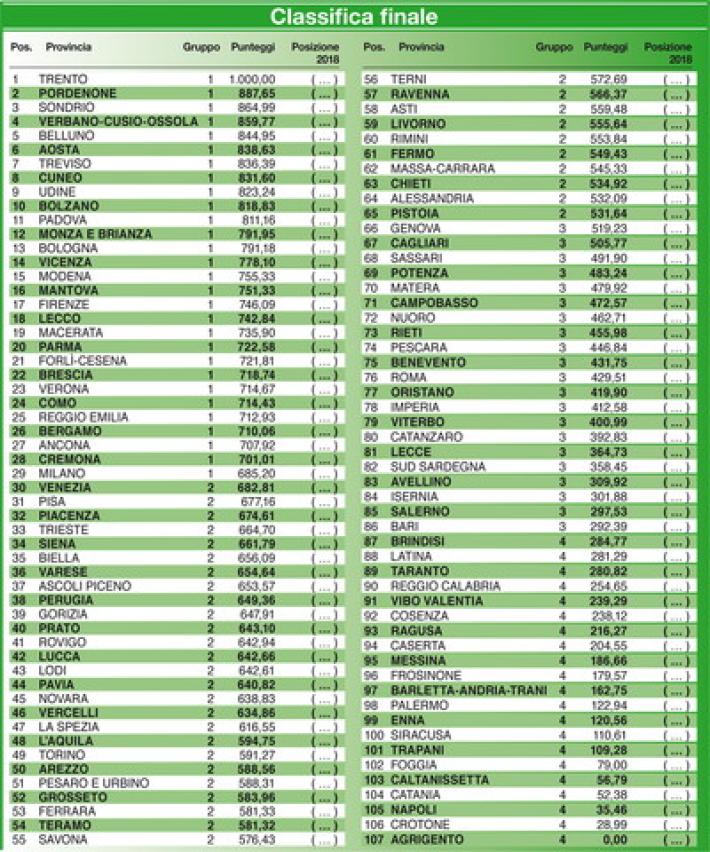 I dati dimostrano che nel 2019 la qualità della vita in Italia è complessivamente migliorata. Oggi sono 65 su 107 le province italiane in cui la qualità di vita è buona o accettabile: un dato che risulta il migliore degli ultimi cinque anni. Nel 2015, infatti, le province in cui si vive bene erano 53 su 110, nel 2016 e 2017 erano diventate 56 su 110, nel 2018 avevano raggiunto quota 59 su 110. Le prime dieci province appartengono, ancora una volta, al Nordest o al Nordovest: dopo Trento, ci sono Pordenone, Sondrio, Verbano-Cusio-Ossola, Belluno, Aosta, Treviso, Cuneo, Udine e Bolzano, che scende dal primo al decimo posto rispetto al 2018.