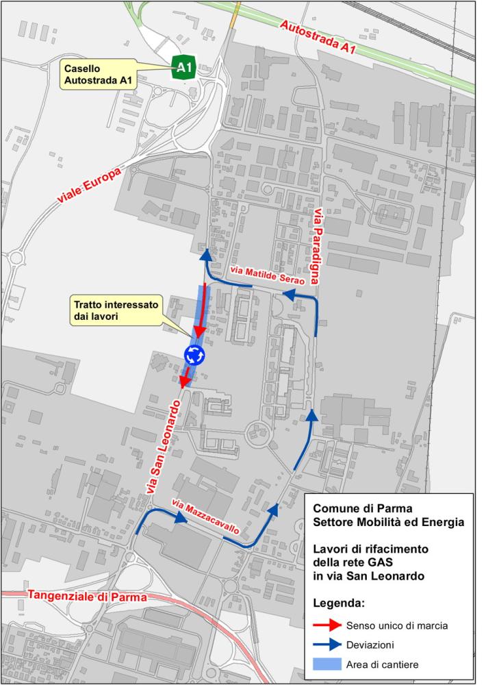 I veicoli, che normalmente percorrono via San Leonardo direzione Casello Autostrada A1 – Colorno, verranno deviati con apposita segnaletica sul seguente percorso: