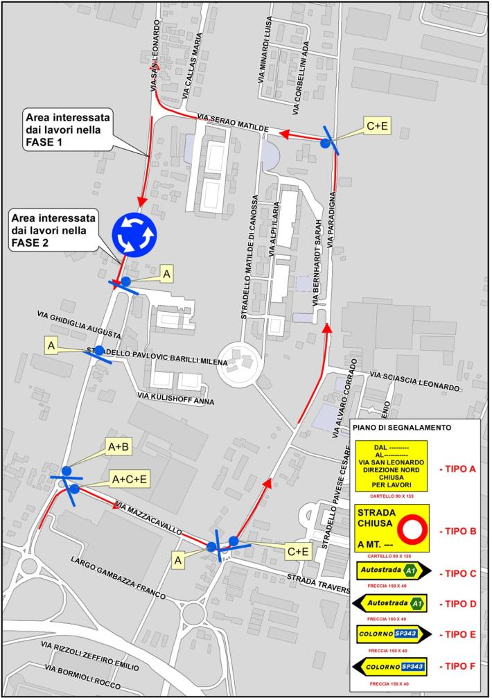 Dalle ore 9 di lunedì 13 maggio a venerdì 21 giugno sono previsti restringimenti di carreggiata pari ad una corsia di marcia e contestuale istituzione del senso unico di marcia direzione Nord-Sud; l'istituzione del divieto di fermata da attuarsi in maniera non contestuale per i seguenti tratti stradali: Via San Leonardo, tratto compreso tra via Matilde Serao e la rotatoria posta in tra il civ.99 ed il civ.93 (Ex Tarasconi); Via San Leonardo, tratto compreso tra la rotatoria posta in tra il civ.99 ed il civ.93 (Ex Tarasconi) e via Matilde Serao e via Rosa Luxemburg.