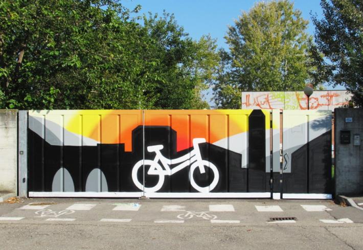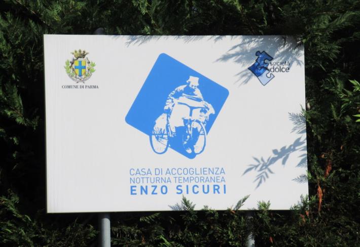 Enzo Sicuri (1907-1988), l’indimenticato «filosofo», clochard per scelta, che tanti parmigiani ricordano ancora, ha una bicicletta nuova fiammante. È dipinta in strada Santa Margherita all’ingresso della «Casa di accoglienza notturna temporanea» del Comune di Parma, a lui intitolata e gestita dalla cooperativa sociale Società Dolce.