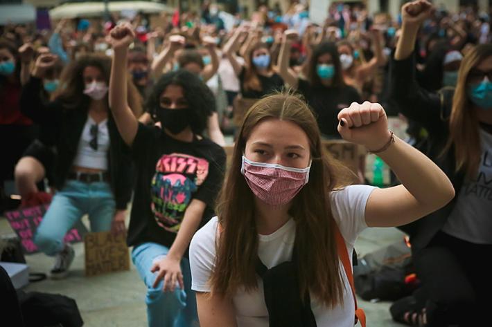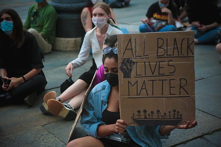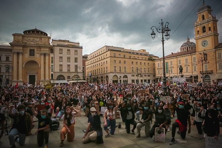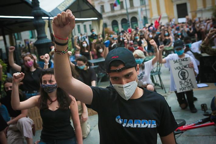 Si spengono i microfoni, cala il silenzio e arriva il momento che tutti aspettavano. Ginocchio a terra e pugno destro in alto per otto minuti: il tempo che è costato la vita a George Floyd. Nessuno si sottrae a quel gesto diventato di commemorazione e insieme di protesta.