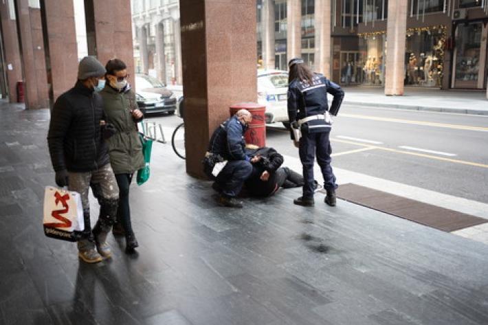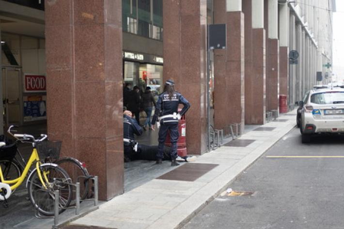Ma è questa mattina che l'«uomo nudo» ha dato il peggio di sè  fino a finire in arresto. Prima di esibito in "abito classico" in vicolo Sant'Ambrogio: i passanti hanno avvertito la polizia locale e l'uomo è stato multato per atti osceni.