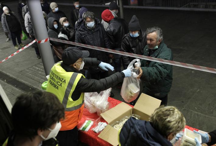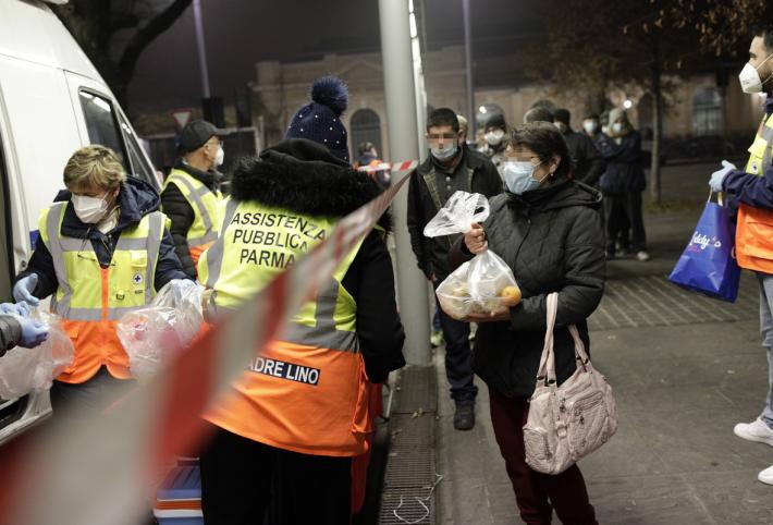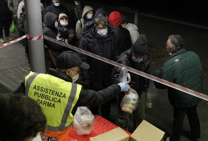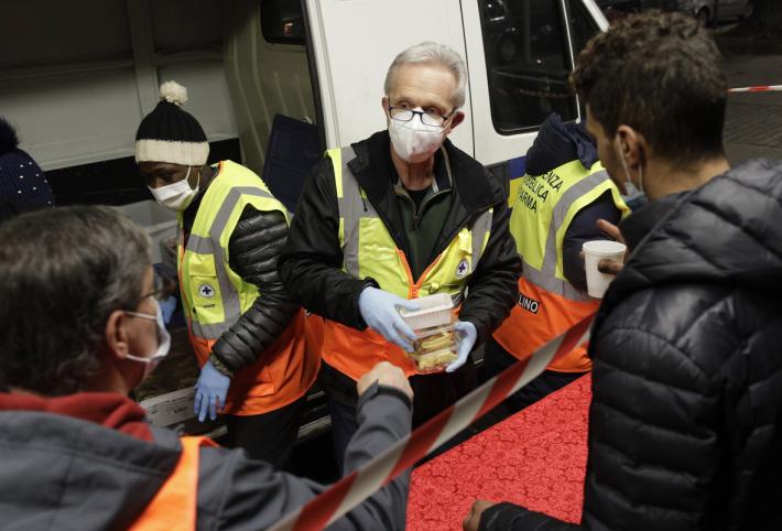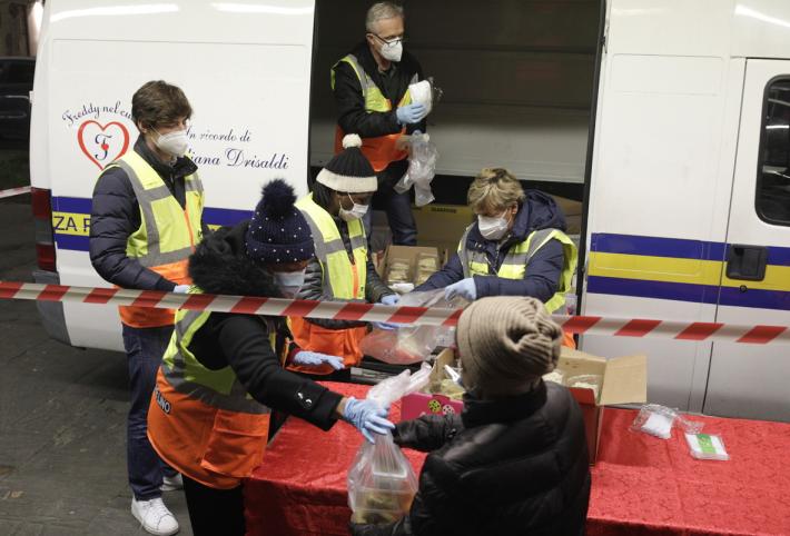 Per evitare rischi di contagio ieri (giovedì) sera non si è tenuta la grande tavolata per gli invisibili al piano -1, ma è stato comunque distribuito del cibo caldo in sacchetti da asporto grazie ai volontari dell'Assistenza Pubblica, della Comunità di Sant’Egidio, City Angels, Ronda dei cuori Amici di Joe e Uniti in Cristo.