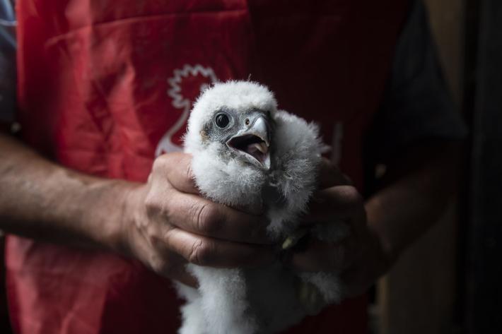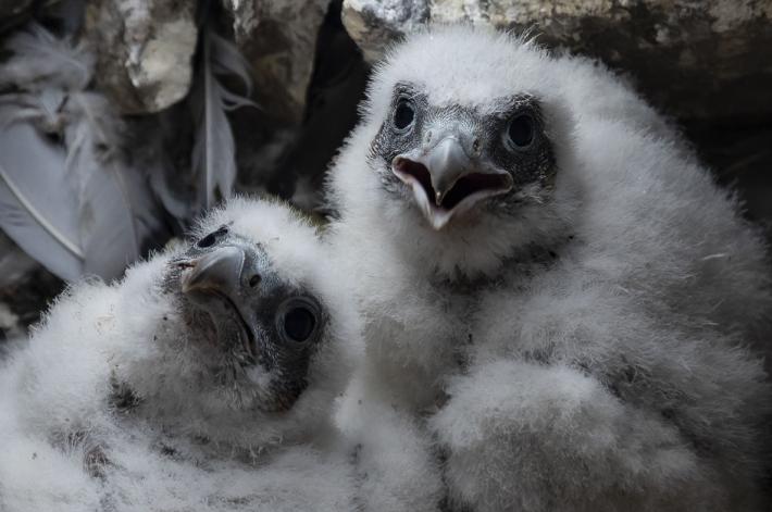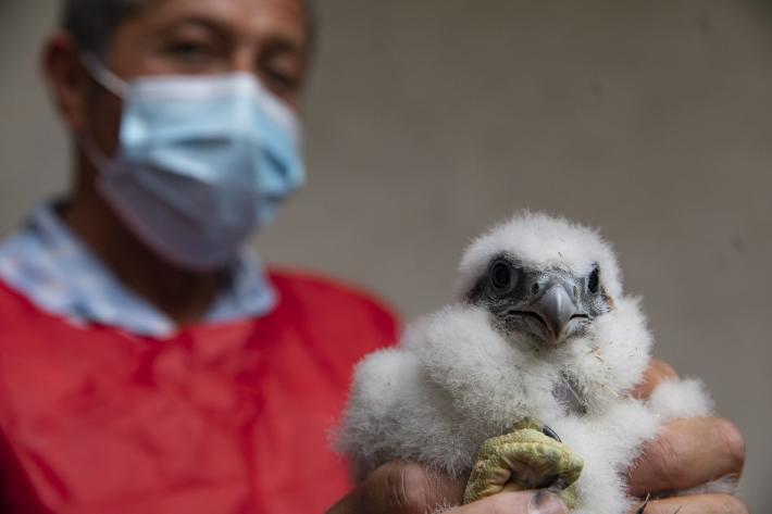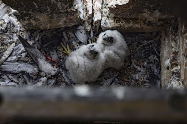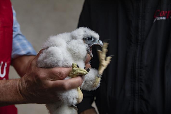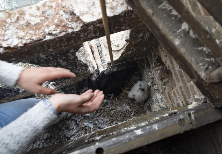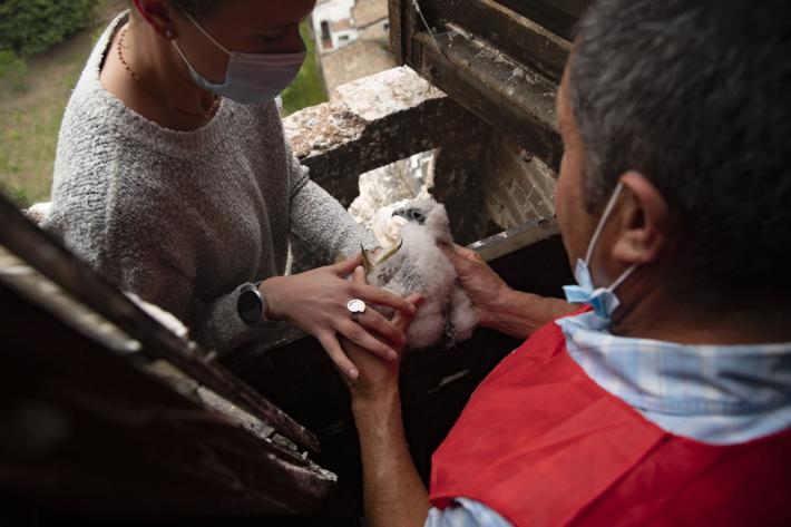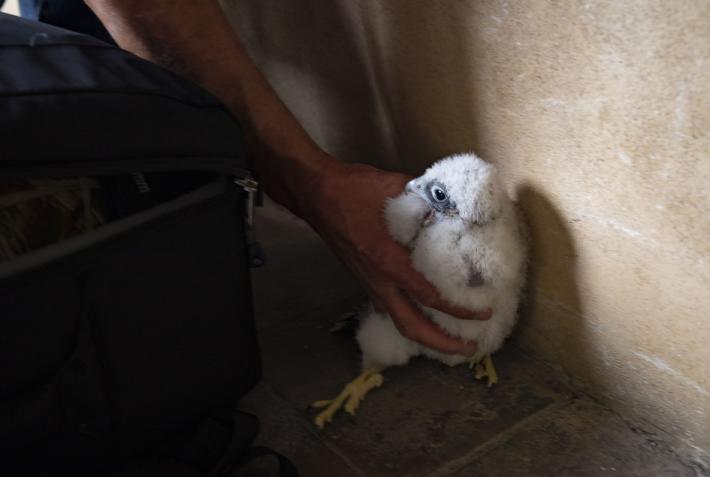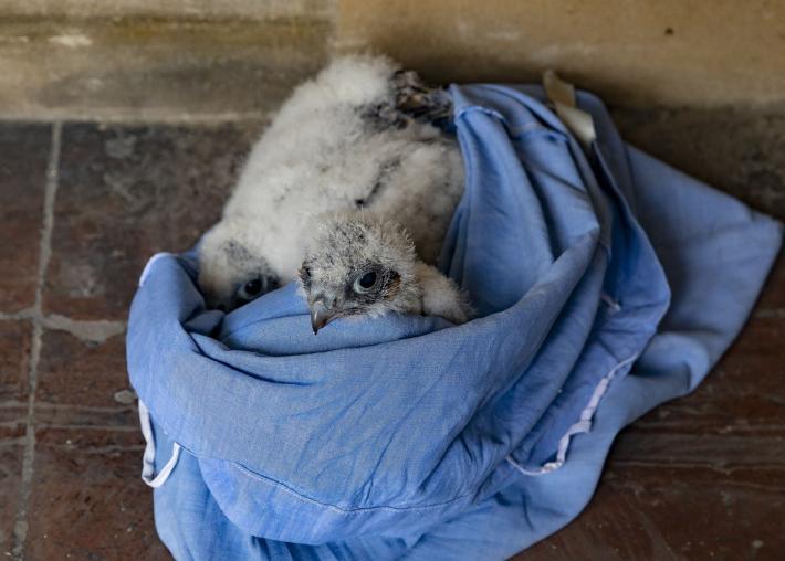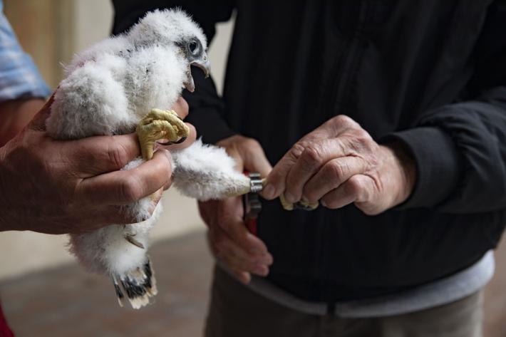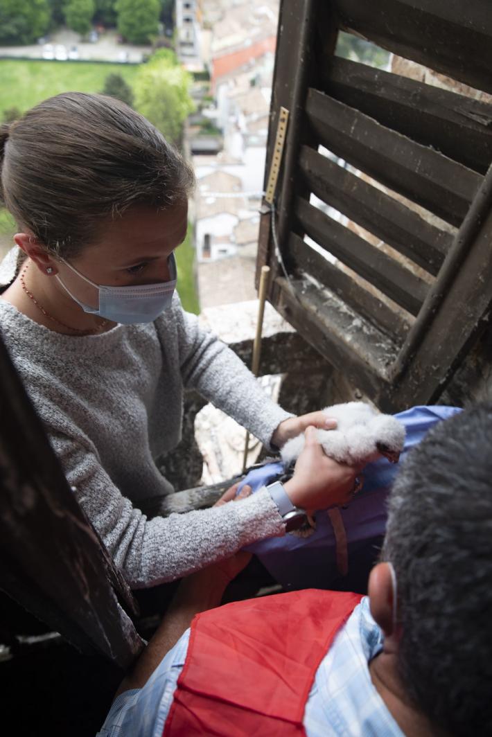 Si chiamano Adele e Antonio i due piccoli falchi pellegrini nati a 75 metri di altezza, sul campanile della chiesa di San Giovanni.