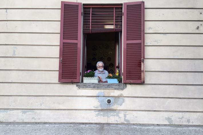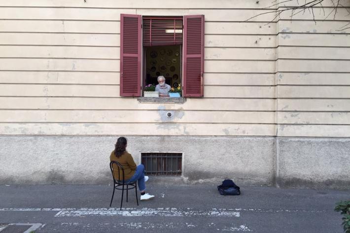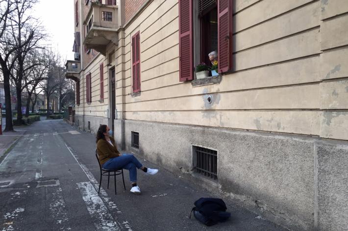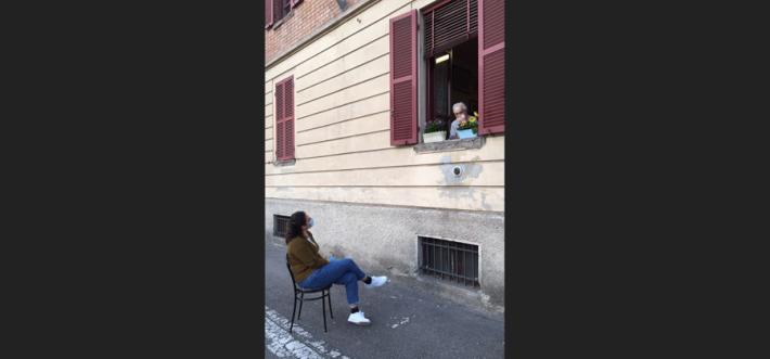 Viale Vittoria. La nipote si chiama Alina. La nonna Paola.  Lei le consegna la spesa. Poi la sedia, cosi come si vede. Da lontano. Alcuni metri di distanza. Eppure si sente quanto siano vicine, da sempre. Si fa come si può, e a volte è moltissimo. Vicino a qualcosa di perfetto.