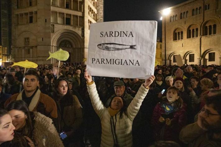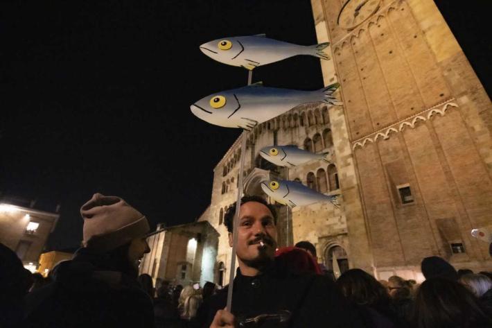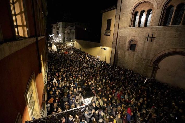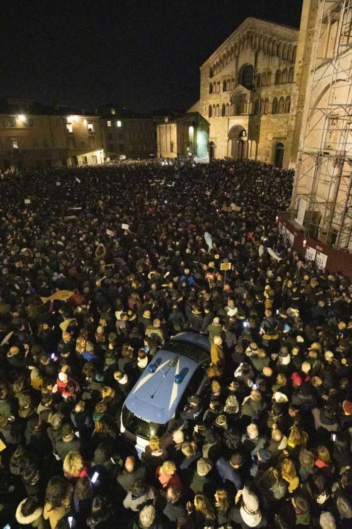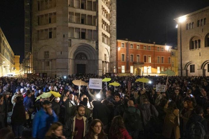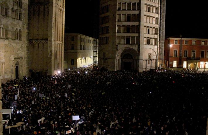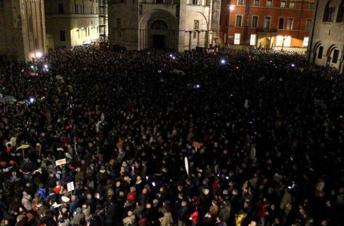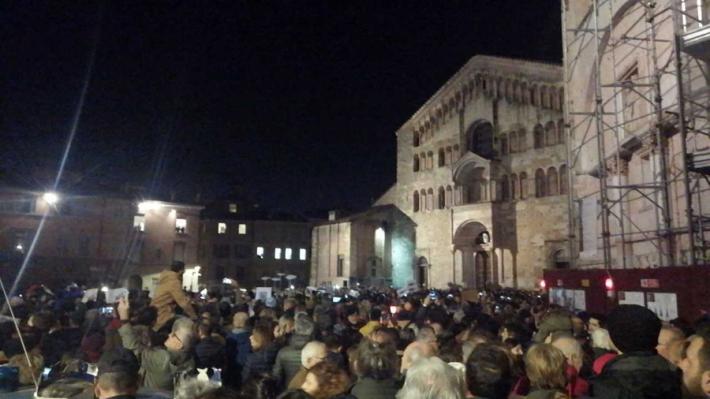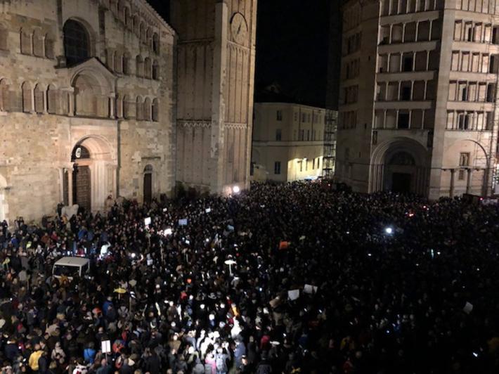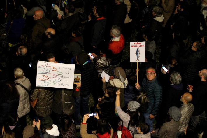 Piazza Duomo gremita, a Parma, per l'adunata delle 'sardinè. Migliaia di manifestanti (le stime vanno di seimila ai diecimila) hanno 'invasò l’intero spazio mostrando cartelli e i cartoncini con il profilo dell’ormai celebre pescetto. Assenti, invece, simboli di partito o ricollegabili alla politica.