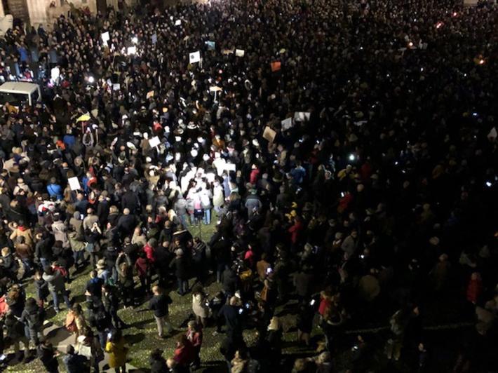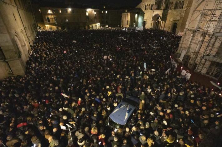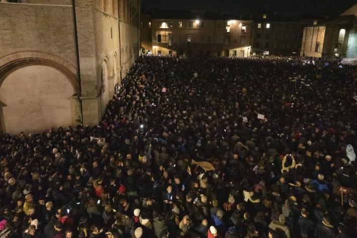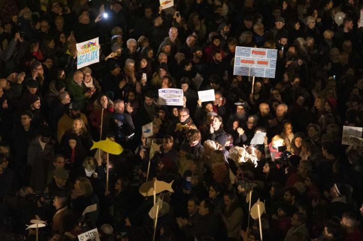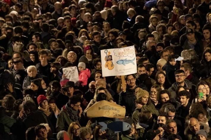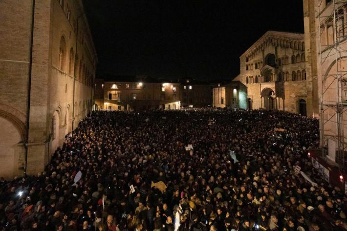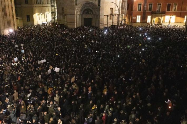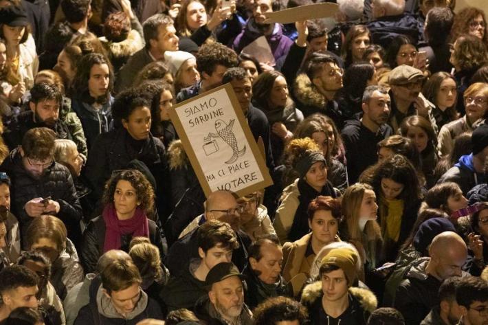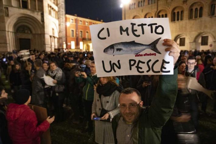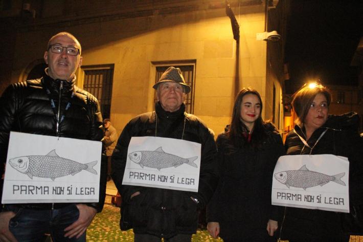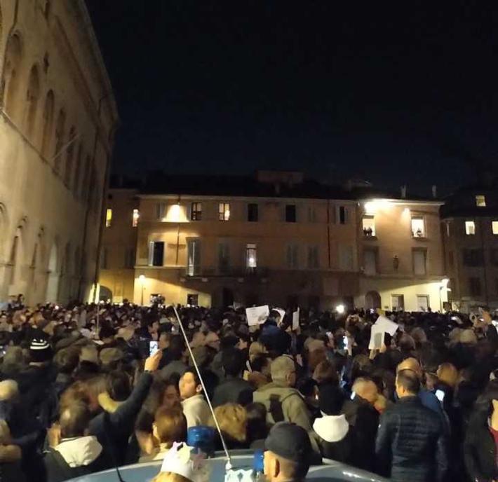Piazza Duomo gremita, a Parma, per l'adunata delle 'sardinè. Migliaia di manifestanti (le stime vanno di seimila ai diecimila) hanno 'invasò l’intero spazio mostrando cartelli e i cartoncini con il profilo dell’ormai celebre pescetto. Assenti, invece, simboli di partito o ricollegabili alla politica.
