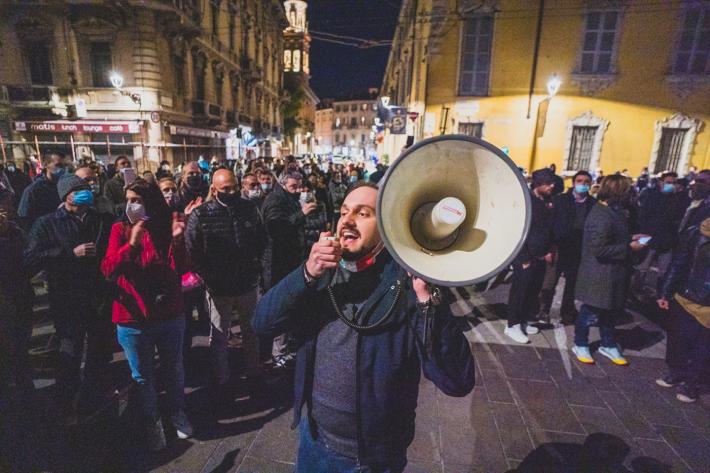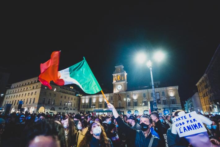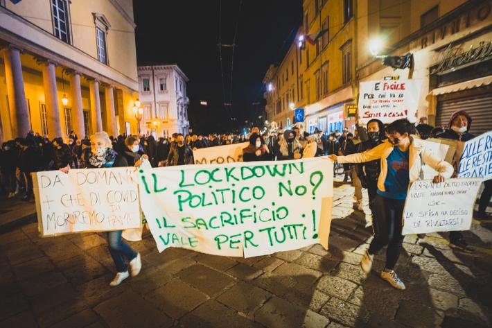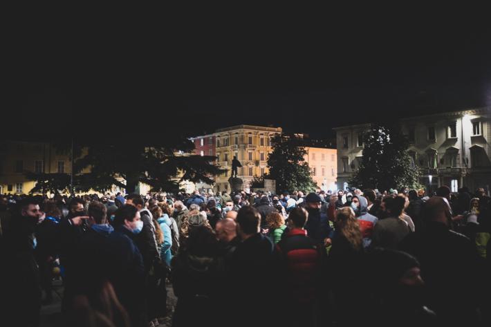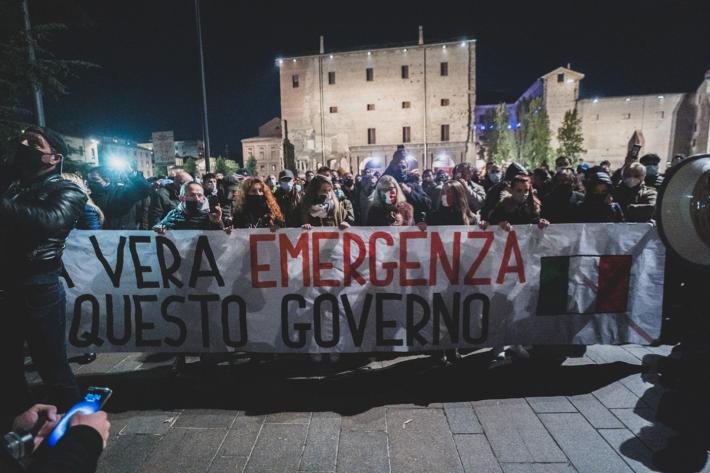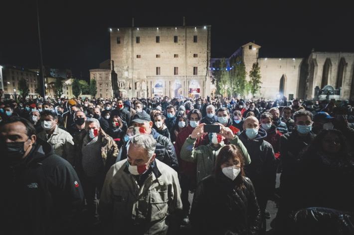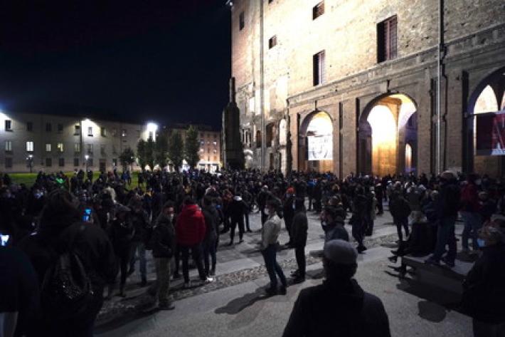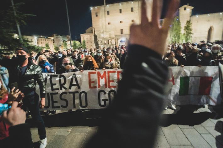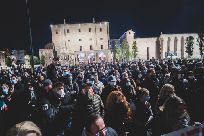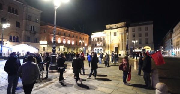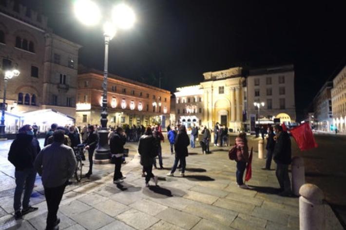 La manifestazione in centro a Parma contro il Dpcm che ha introdotto le nuove misure contro la diffusione del virus si è tenuta ieri era senza causare problemi di ordine pubblico, tranne lo scoppio di qualche petardo (o bomba carta) senza conseguenza. Sono stati uditi cinque botti, uno dei quali davanti al Teatro Regio. Piazza della Pace dopo le 21 ha cominciato a riempirsi raggiungendo - pare - un migliaio di persone.