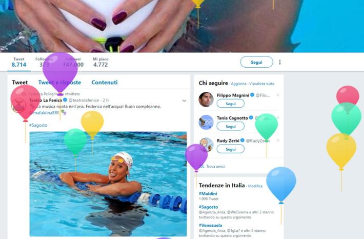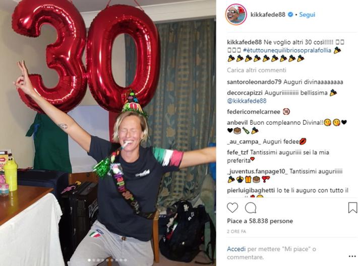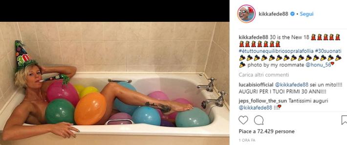 Una vasca da bagno, senz'acqua ma co0n tanti palloncini colorati e dentro lei, la Divina, Federica Pellegrini, 30 anni oggi. E’ il modo di festeggiare social scelto dalla campionessa olimpica e mondiale che ha scelto una foto coloratissima (con tanto di cappellino a punta) di 'kikkafede88' accompagnata dalle parole #ètuttounequilibriosopralafollia #30suonati, aggiungendo poi su twitter (@mafaldina88) «ne voglio altri 30 così».