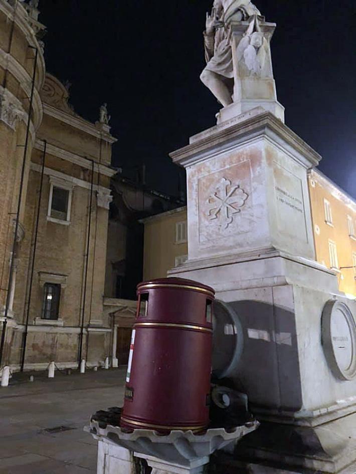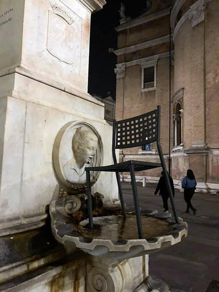 Vandali in azione nella notte in piazza della Steccata. Un cittadino ha pubblicato le foto sul gruppo Facebook Sei di Parma se... Come si vede nelle immagini, nella notte qualcuno ha messo unasedia e un bidone posacenere nella fontana in piazza della Steccata.