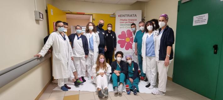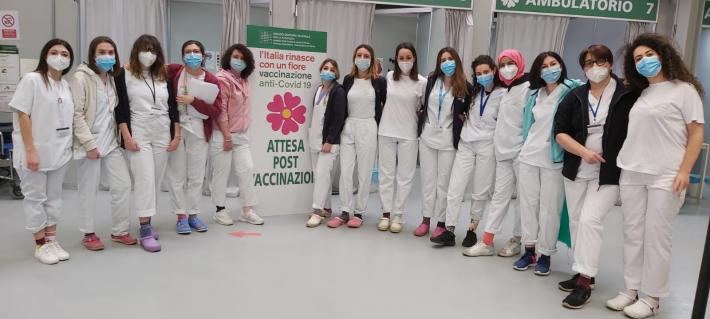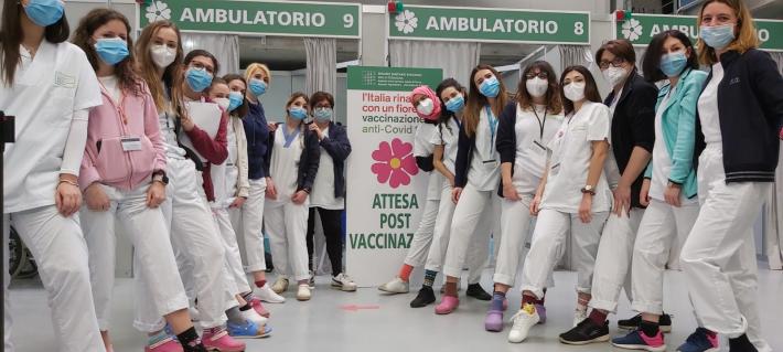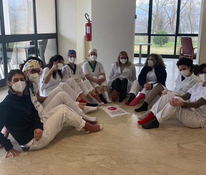 Gli operatori degli hub vaccinali (via Mantova, Vaio, Borgotaro e Langhirano) che hanno aderito alla giornata dei calzini spaiati- Foto