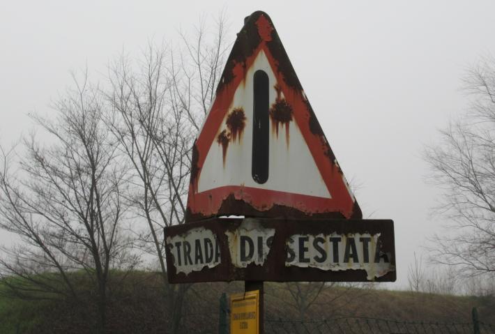 La superbia, si sa, è uno dei sette peccati capitali. Consiste nel ritenersi meglio di tutti e di tutto, come – verrebbe da dire – succede a un segnale stradale che si trova in strada Paradigna, nelle vicinanze di via Forlanini, in direzione del centro città. Ad essere «dissestata», però, non è strada Paradigna, che si trova in condizioni accettabili né più né meno della maggior parte delle strade di Parma, ma «dissestato» è il segnale stesso: arrugginito, piegato e anche «fuorilegge» perché dal 1993, con l’entrata in vigore del nuovo Codice della strada, è stato sostituito dal segnale che riporta al centro un punto esclamativo.