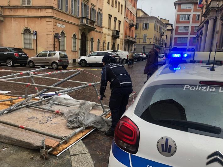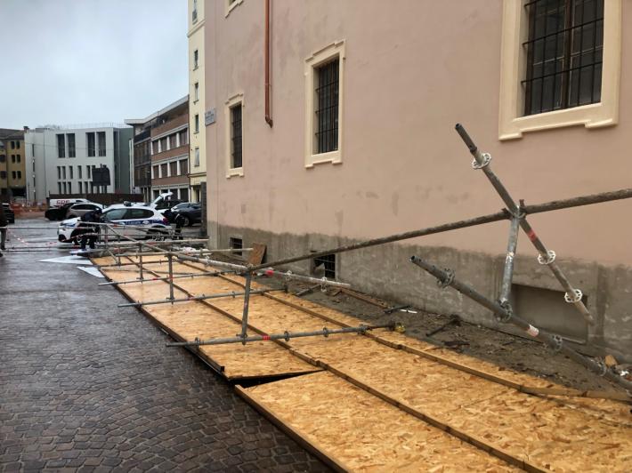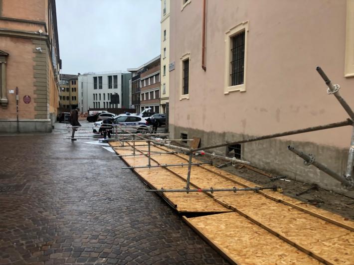 Tra i danni causati dal forte vento che ha sferzato la città con le sue raffiche violentissime c'è il crollo di un'impalcatura in via Cavestro. Inoltre i vigili del fuoco sono intervenuti in tangenziale Nord e nei pressi dell'hotel Parma e Congressi per rimuovere dei rami che intralciavano la circolazione.