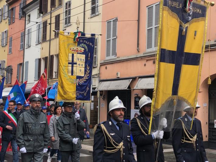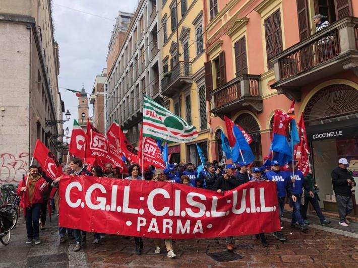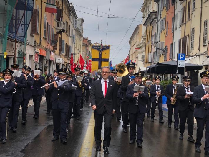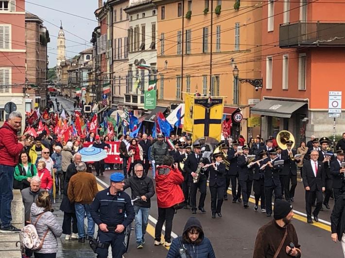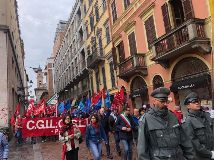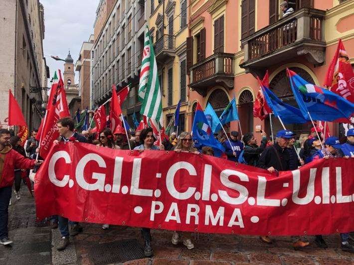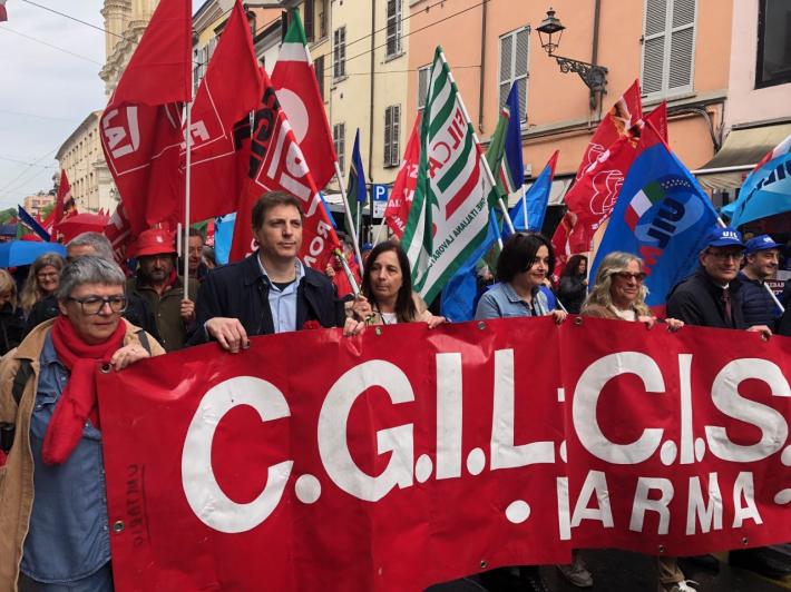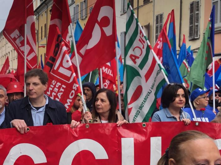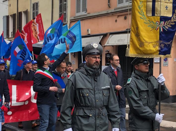 È partito da barriera D'Azeglio, sulle note de "L'inno dei lavoratori" e, a seguire "Bella Ciao" il tradizionale corteo del 1 maggio, che proseguirà con la deposizione delle corone al Monumento al Partigiano e alla lapide ai caduti. Le vie del centro vengono attraversate dai cittadini (autorità comprese, fra cui il sindaco Michele Guerra e il presidente della Provincia Andrea Massari) al passo lento della memoria, delle melodie del corpo bandistico Giuseppe Verdi, tra le bandiere dei diversi sindacati e tanti garofani rossi. Un corteo che non si arresta, nonostante la pioggia. La conclusione è avvenuta sotto i portici del Grano, davanti al Municipio, con il comizio a cui hanno preso parola Domenico Proietti, segretario nazionale conf. Uil, Matteo Rampini, segretario confederale Cgil Parma e il sindaco Michele Guerra, che hanno commentato, fra le tante cose, anche la scelta del Governo di riunire il Consiglio dei ministri proprio il 1 maggio (per il decreto con le nuove misure per il lavoro). "Inzia oggi un mese di mobilitazioni per Cigl, Cisl e Uil. In questi mesi abbiamo avanzato tante proposte, ma non sono arrivate risposte positive e in linea con quanto abbiamo chiesto - ha affermato il segretario nazionale Uil Proietti -. Dobbiamo agire insieme affinché la precarietà non caratterizzi più il lavoro di intere generazioni: dobbiamo stabilire che i contratti devono essere a tempo indeterminato e garantire certezze ai giovani e al loro futuro". Presenti in rappresentanza dei sindacati anche Angela Calò segretaria generale Cisl, Lisa Gattini CGIL PARMA e Mario Miano segretario Uil Parma.
