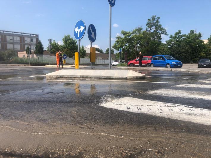 Acqua in via Toscana, angolo via Lazio per la rottura/perdita di una tubatura della rete idrica. Strada allagata.
