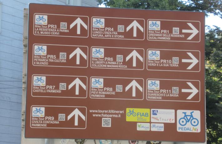 Nel cartello grande, in basso, ci sono i loghi di Fiab Parma-Bicinsieme, TourEr e PedalArt, oltre ai siti www.tourer.it/itinerari e www.fiabparma.it. Per gli appassionati di cicloturismo (e di turismo «sostenibile», utilizzando anche il treno) questi cartelli sono sicuramente di grande importanza.